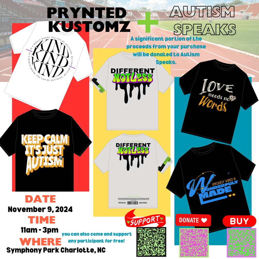 Please specify the shirt and size you need when ordering. A significant portion of the proceeds from your purchase will be donated to Autism Speaks.